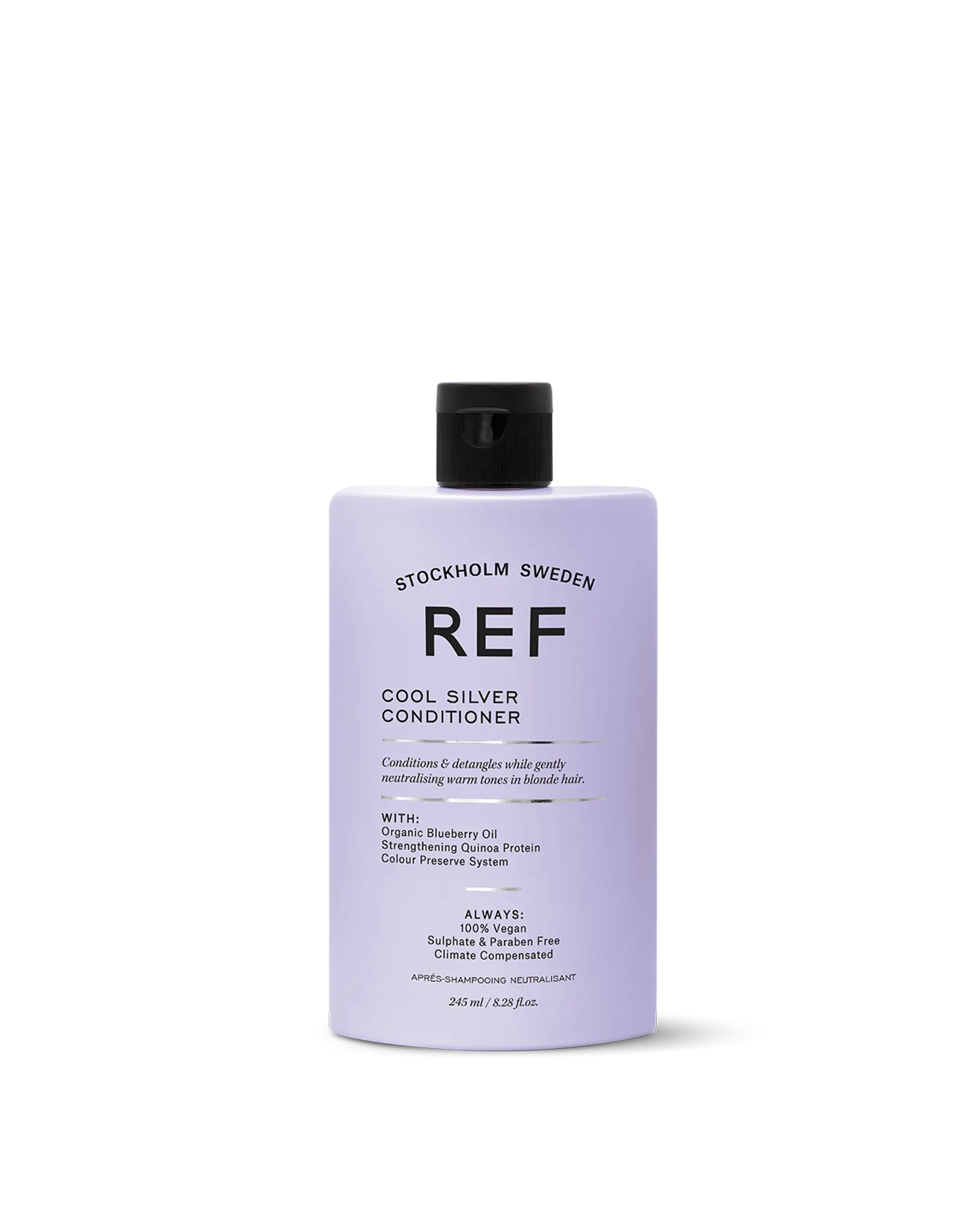 Enhance cool blonde, grey, and silver tones with REF Cool Silver Conditioner. Specially formulated with purple pigments and organic blueberry extract, it neutralizes brassy tones while conditioning hair deeply. It leaves hair incredibly soft, nourished, and full of shimmering, icy brilliance. Use regularly with Cool Silver Shampoo for maximum toning effect and lasting vibrancy.