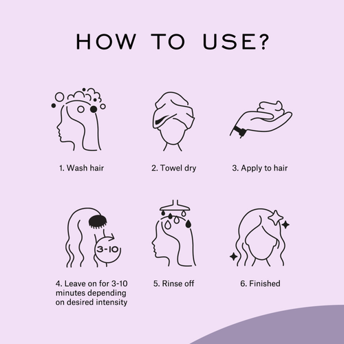 Apply to washed, towel dried hair. Leave on for 3-10 min depending on desired intensity. Rinse off and finish with conditioner.