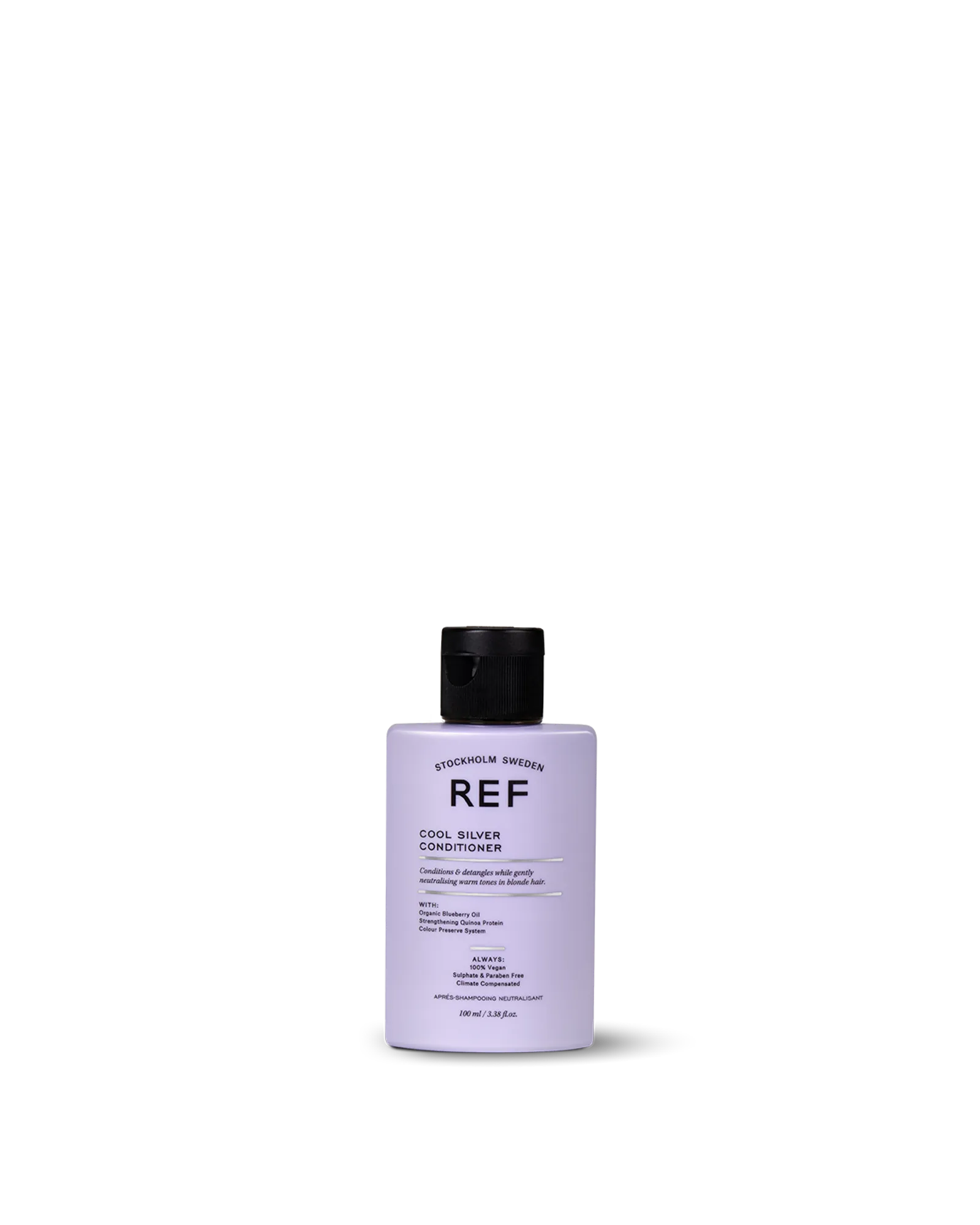 REF Cool Silver Conditioner neutraliserar varma gula toner och förstärker kalla blond-, grå- och silvernyanser. Formulan är berikad med lila pigment och ekologiskt blåbärsextrakt, vilket ger djupt vårdat hår med mjukt, glänsande och iskallt skimrande resultat.För bästa effekt, använd tillsammans med REF Cool Silver Shampoo för långvarig färgintensitet och perfekt tonad finish.