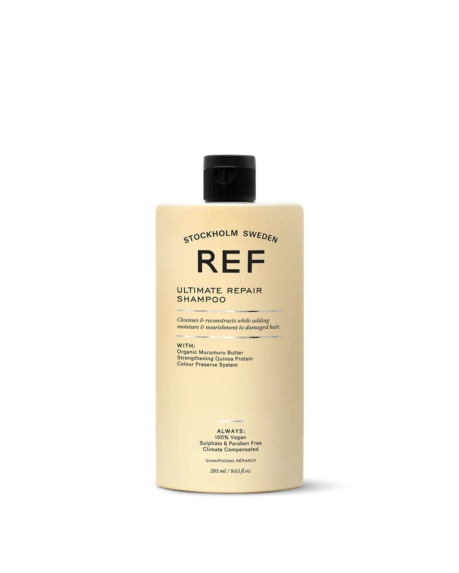 Reparerande schampo för skadat, stressat hår. REF Ultimate Repair Shampoo är speciellt utvecklat för att återställa styrka och glans. Den unika botaniska blandningen rengör skonsamt samtidigt som den stärker och reparerar hårstrået. Murumurusmör och quinoaprotein reparerar skadade bindningar och minskar kluvna toppar, vilket ger mjukt, motståndskraftigt och livfullt hår. Schampot är idealiskt för kemiskt behandlat, värmeskadat eller känsligt hår och återupplivar det utan att tynga ner. Upplev salongsvård hemma med varje tvätt och ge håret den omsorg det förtjänar.